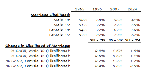 The nuance compared to the third place adaptation story is that the dating industry also drained its own profit pool. The dating game has run out of fuel. After a sugar high of engagement during the COVID pandemic virtually all of the dating apps focused on heterosexual coupling hit user growth saturation points shortly after the world re-opened. Many hopeful daters have given up on the online dating game, convinced that finding a committed match is too hard and not worth it. Ordinary guys struggle to get matches; they get crowded out of the game. Attractive women have endless options to “play the field.” There always seems to be patch of field where the grass looks greener. Marriage rates are roughly 20% lower for “prime age” (30-35) males and females than they were 20 years ago.