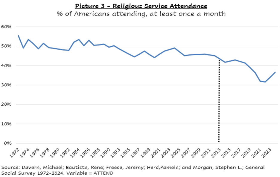 The chart below captures time series data on the percentage of Americans showing up for church: down 35-40% in the fifty-odd years from 1972. There is no time series on being there. But my hunch, informed from experience, is that it has suffered a much faster slope of decay.