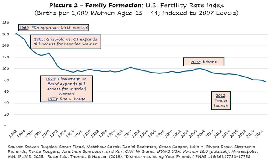 Regarding fertility – the downstream impact of fewer marriages has been fewer kids. The fertility rate held close to flat for forty years after the passage of Roe v. Wade but is down over 20% since the launch of the iPhone. The out-of-wedlock birthrate has been roughly flat since 2007. Virtually all of the decline in childbearing has come from fewer marriages. The dating industry did not set out to curtail fertility, but the data suggest that its impact may be on a similar scale to that of the lynchpin Supreme Court case of the culture wars.