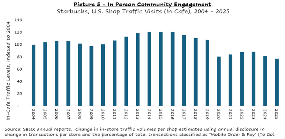 With the benefit of hindsight, it was the iPhone and Instagram that drained all the good fuel out of Starbuck’s third place growth tank. The in-person transaction volumes per U.S. shop – the best proxy for the third place strategy – are down about 25% in the last two decades. While the mission died, the equity story did not end. Starbucks found new fuel. Its stock has still outperformed the S&P 500 since mid-2007 (it’s up ~6x compared to the S&P 500 up ~3.5x).