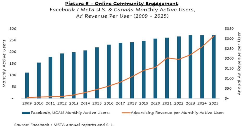 Investors viewed the shift as existential for Facebook; the stock dropped 70% in 2022 as the company worked through it. But it worked. It turns out that AI-generated content not only keeps consumers in the app longer, but that it also creates much more valuable advertising inventory. Facebook’s annual advertising revenue per user is up ~50% (from ~$200 to ~$300) since the 2022 strategy pivot away from its social network roots.