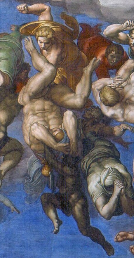 The Last Judgement is a very different masterpiece than Dante’s Divine Comedy. Michelangelo does not excruciatingly label the typical sins of the damned as Dante did. He makes one exception: the figure upside down in the bottom right portion of The Last Judgement. He is being pulled down by demons towards Charon’s Boat and the mouth of hell. From his waist dangle two keys – a reference to Peter’s two keys to the church – and a moneybag. Look at the painting. Then close your eyes and imagine Tetzel’s coins inside.